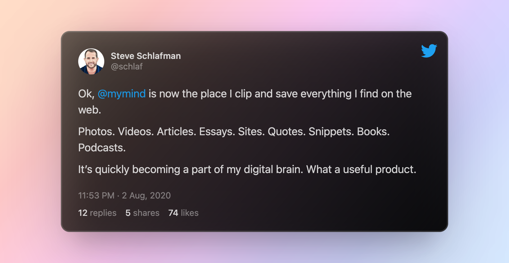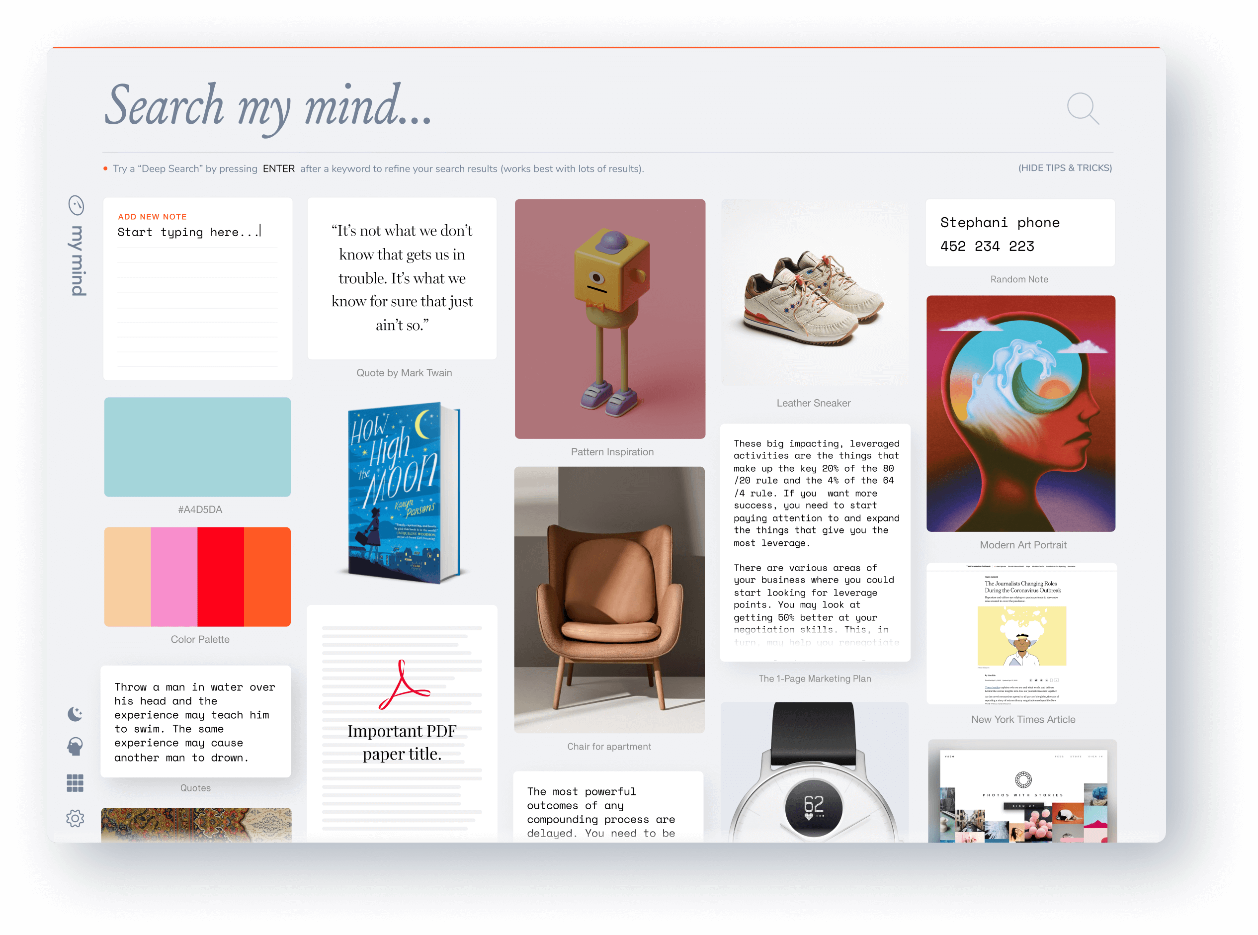 MyMind is the most spectacular yet minimal second brain. A catch-all for thoughts. A private dump for all ideas and information. It has the potential to replace nearly every other tool you have used for collecting, thinking, writing, and inspiring.