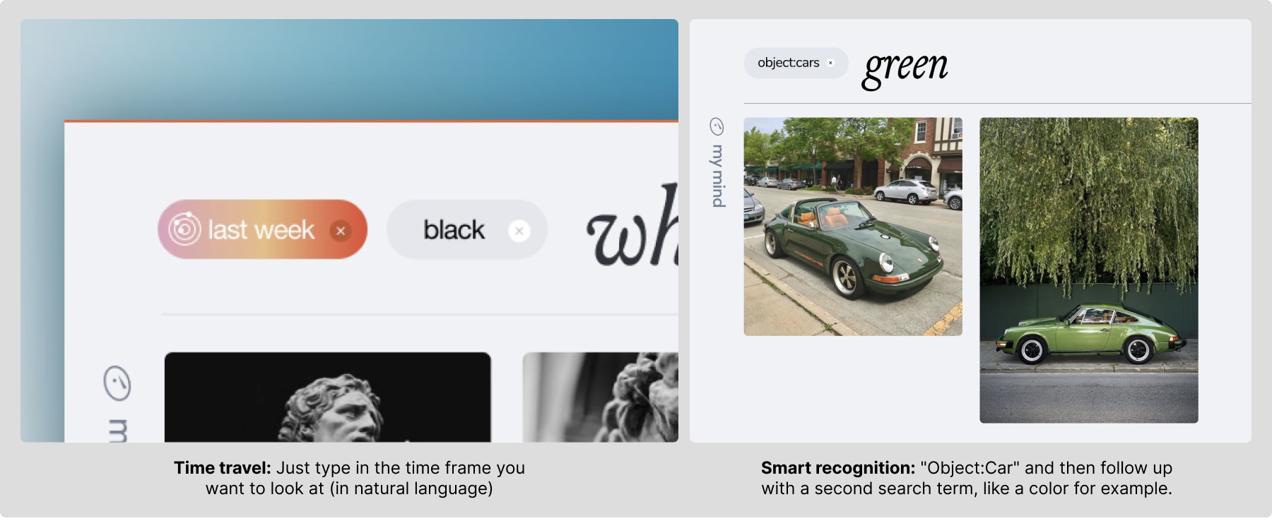 #2 🔍 Magical search: You can search anything you've saved - articles, images, notes, text snippets - in an instant. It's like your brain: You can type in anything you remember from the saved piece of information like objects, text, or even colors. And MyMind will find it for you!