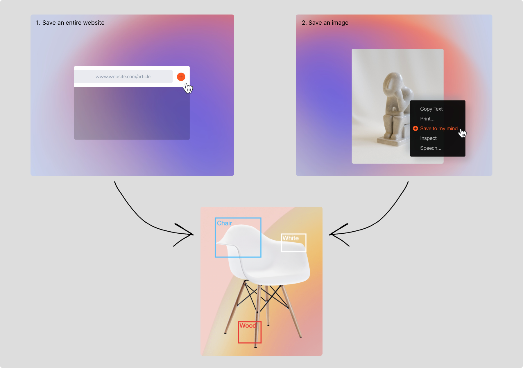 The essence of MyMind is the exact opposite of what you experience in other tools. The idea is to get out of the way and complement your existing workflow.